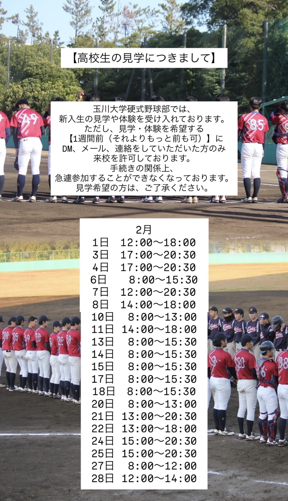 玉川大学硬式野球部では、新入生の見学や体験を受け入れております。